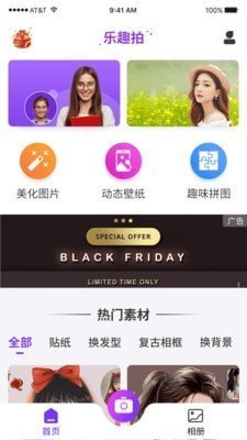 乐趣拍产品功能【脸部识别动态贴图】一键实现瘦脸美白磨皮祛痘功能,呈现最自然的修容。