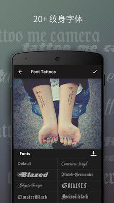 纹身相机是一款可以让你拍出的照片附带纹身的手机拍照软件是个纹身图片编辑应用,纹身相机app从图库导入照片进行编辑或者使用相机拍摄照片进行编辑,海量的纹身滤镜以及精美的团选择,旨在你的纹身照片更优雅的。