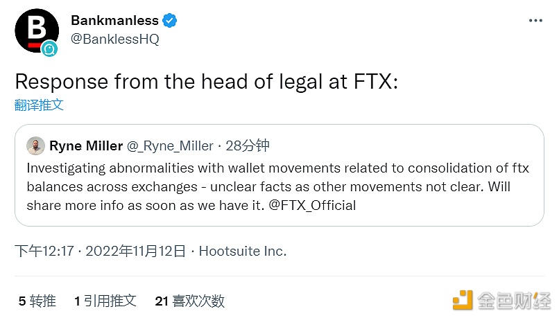 11月12日消息,FTX US法律总顾问Ryne Miller回应,正在调查与跨交易所合并FTX余额相关钱包移动的异常情况,其他移动事实暂不清楚,会尽快分享更多信息。 此前报道,Autism Capital发推称,FTX内部人士很有可能正在试图携款潜逃,目前FTX和FTX US钱包现在都受到影响并将资产混合在一起,被转移的金额约为3.8亿美元,一些钱包被标记为fucksbf和fuckftxandsbf.eth,看起来好像是黑客攻击。